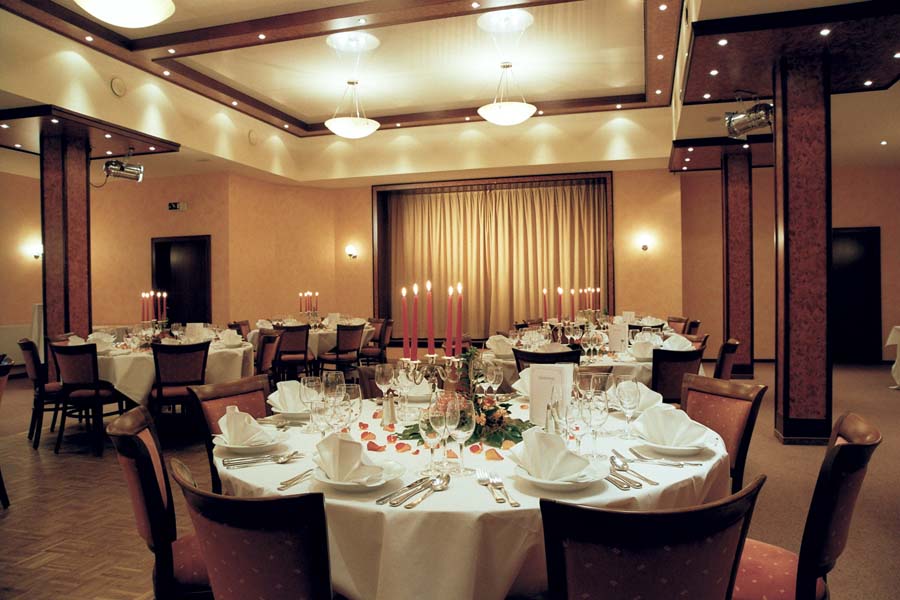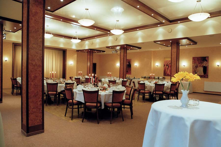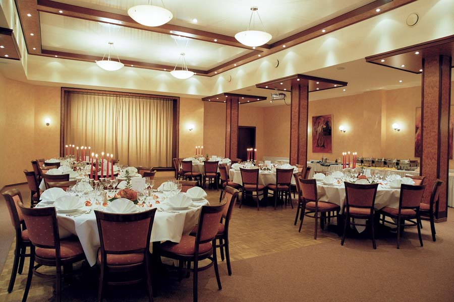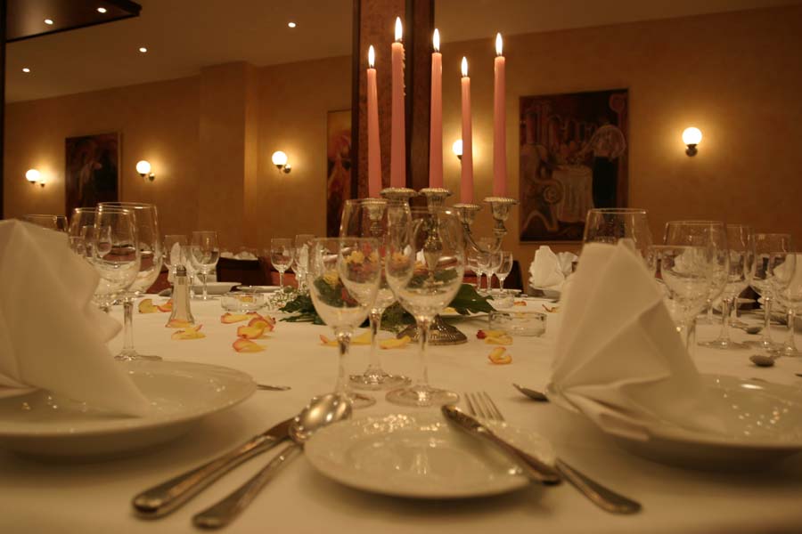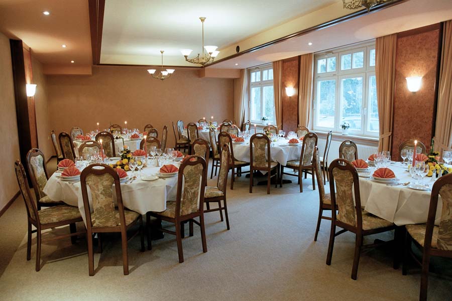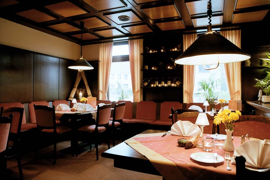 Sowohl vom kleinen Clubraum als auch vom Festsaal aus gelangt man in den sehr geschmackvoll angelegten Sommergarten, der bei Feierlichkeiten mit einbezogen werden kann. Eine rustikale Gaststube mit massivem Eichentresen ergänzt das Angebot für Tages- und Hotelgäste. Für Tagungen, Familienfeiern, Hochzeiten und Veranstaltungen aller Art hält die Küche des Hauses Pauschalangebote, Arrangements und Vorschläge vom internationalen Buffet bis zum klassischen Menü bereit, gerne nach Absprache auch mit Abwandlungen.![]()